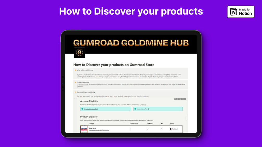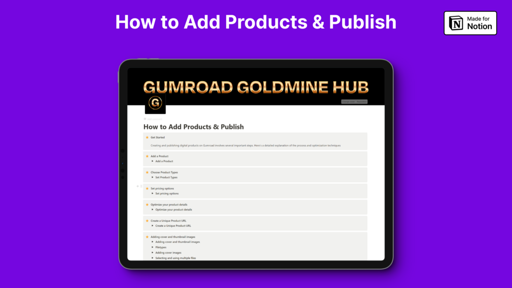 Discover hidden gems and learn proven strategies that will empower you to navigate the platform like a seasoned pro. With the Gumroad Goldmine Hub, you'll uncover the secrets to setting up a captivating store, publishing and promoting your products effectively, and harnessing the full potential of Gumroad's powerful features.