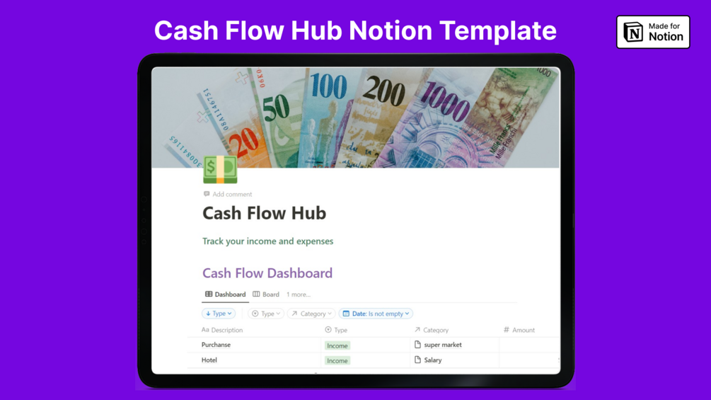 Cash Flow Hub Financial Dashboard in Notion. You can easily track your income and expenses with cateories