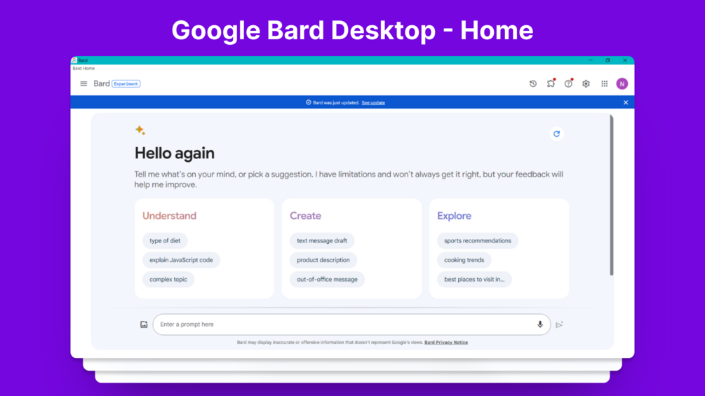 - Natural language processing: Bard Desktop can understand and respond to natural language prompts and questions.