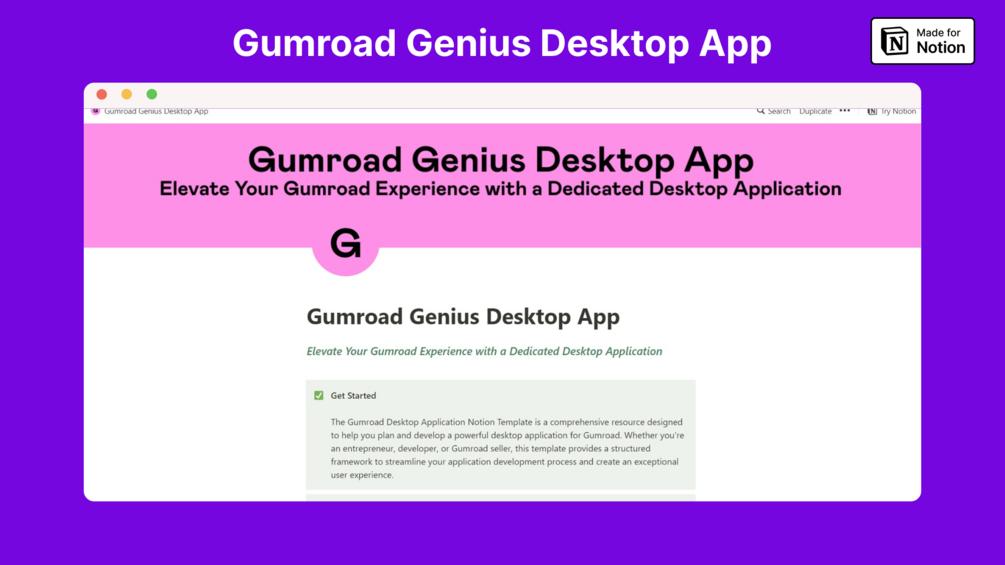 The Gumroad Desktop Application Notion Template is a comprehensive resource designed to help you plan and develop a powerful desktop application for Gumroad. Whether you're an entrepreneur, developer, or Gumroad seller, this template provides a structured framework to streamline your application development process and create an exceptional user experience.