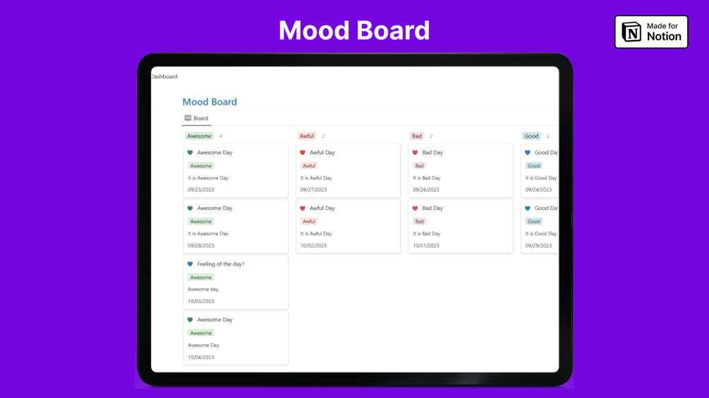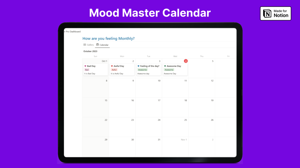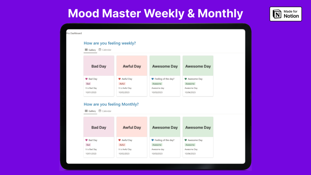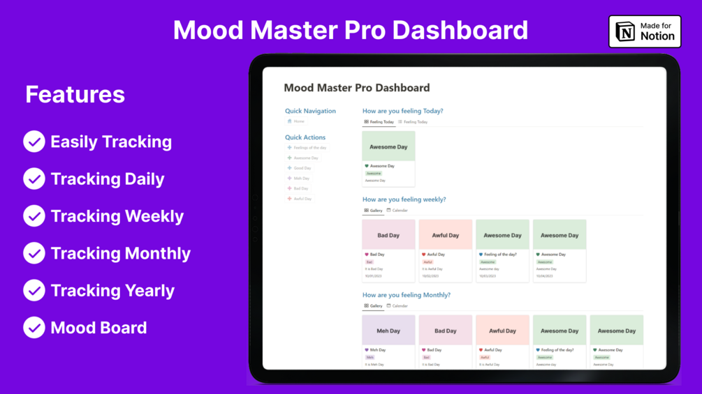The Mood Master Hub Pro Notion template is a comprehensive tool designed to help users track their mood effectively and gain insights into their emotional well-being. It offers a range of features, including daily mood tracking, quick actions, and navigation, as well as the ability to view mood trends on a daily, weekly, monthly, and yearly basis. Users can easily record their feelings of the day, categorizing them as awesome, good, bad, meh, or awful. The template provides a structured and user-friendly environment for managing emotional health and fostering self-awareness.