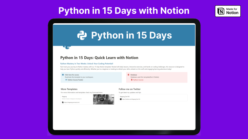 Fast-track your journey to Python mastery with our 15-day Notion template. Packed with daily lessons, interactive exercises, and hands-on coding challenges, this resource is designed to help you learn Python quickly and efficiently. Whether you're a beginner or looking to refresh your skills, embark on this swift and engaging learning adventure today!